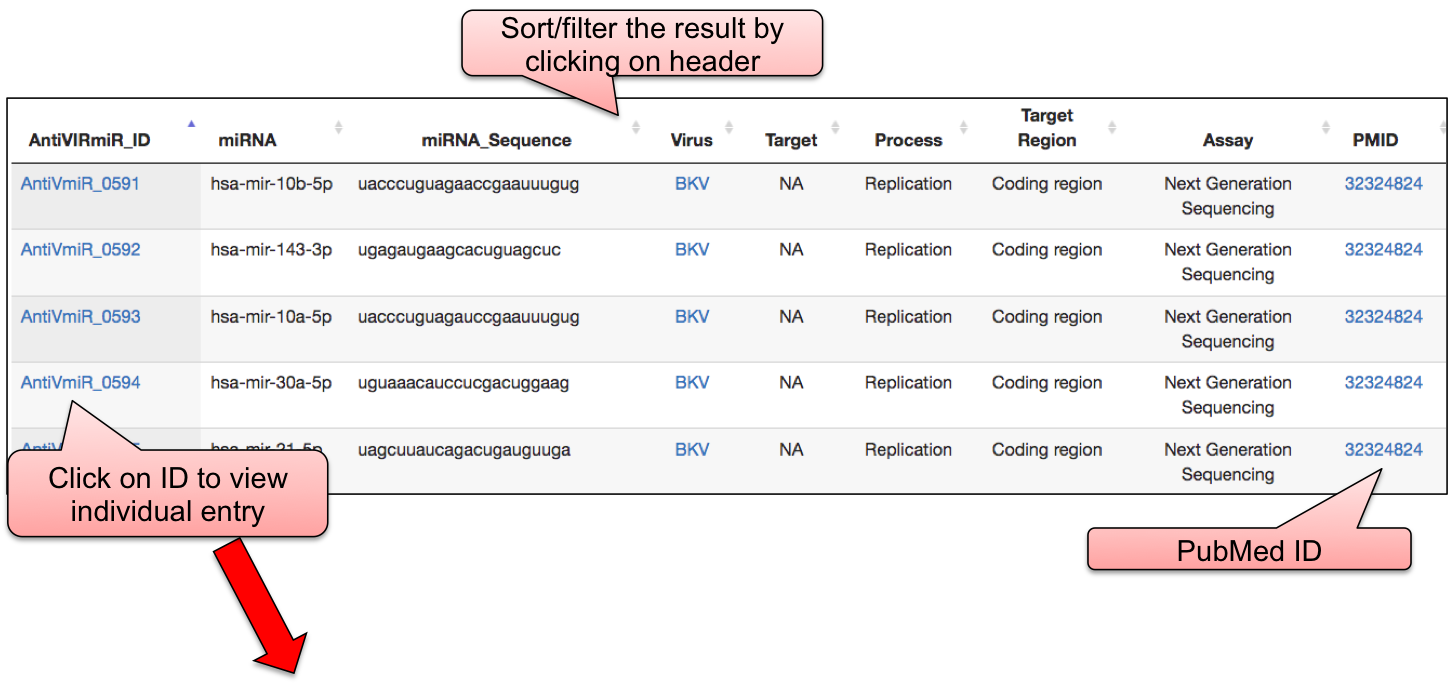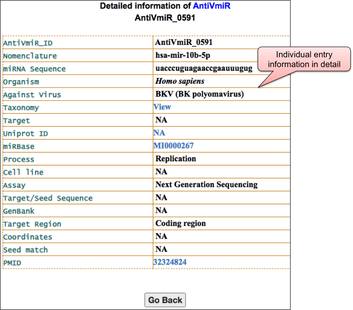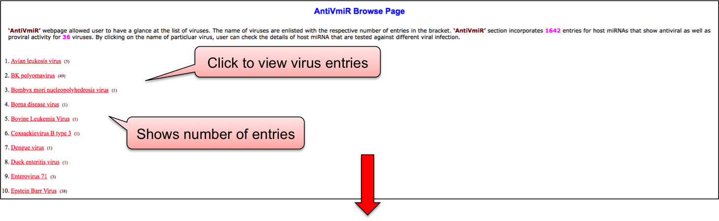 ‘AntiVmiR’ webpage allowed user to have a glance at the list of viruses. The name of viruses are enlisted with the respective number of entries in the bracket. ‘AntiVmiR’ section incorporates 1642 entries for host miRNAs that show antiviral as well as proviral activity for 36 viruses. By clicking on the name of particluar virus, user can check the details of host miRNA that are tested against different viral infection.