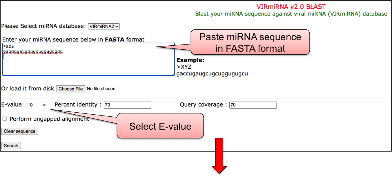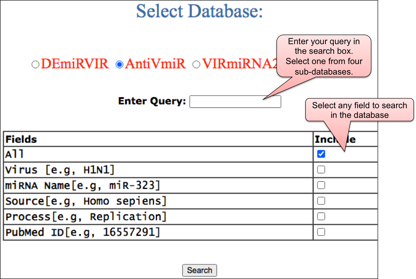 The search option is incorporated into four sub-databases - DEmiRVIR, AntiVmiR, VIRmiRNA2 and VIRmiRTar2. By selecting one option from four sub-databases, the user can enter the query in the box. This query search can be done in any of the given fields like virus name, miRNA name or miRNA sequence etc. or else user can select the “ALL” means query will be searched against all the fields.