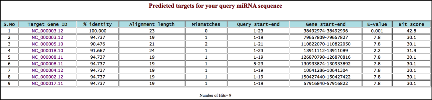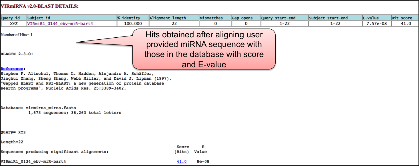 BLAST allows the alignment of user provided miRNA sequence against all the sequence available in our database. This help the user to confirm whether the given miRNA sequence have already been reported in the literature or not.