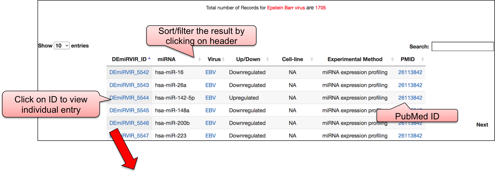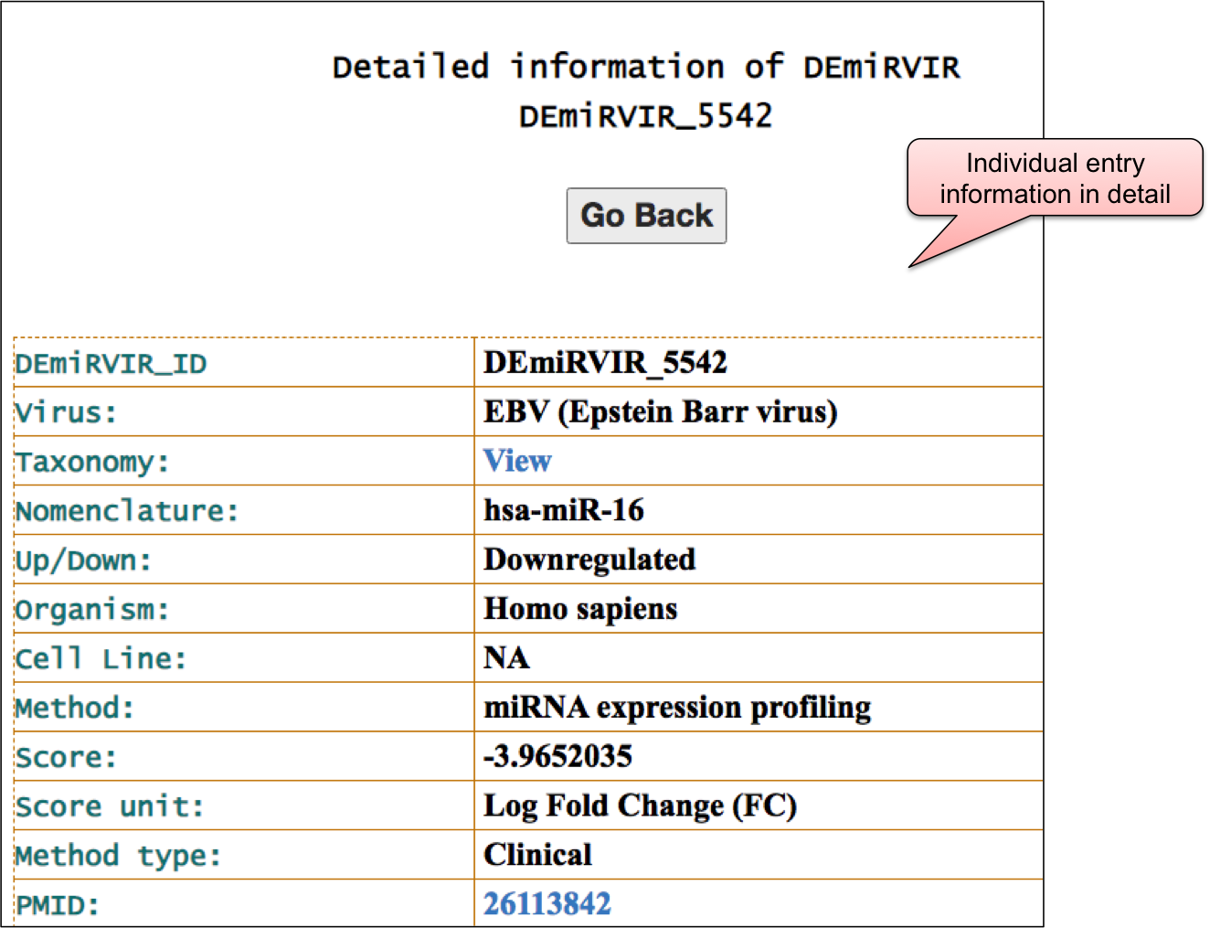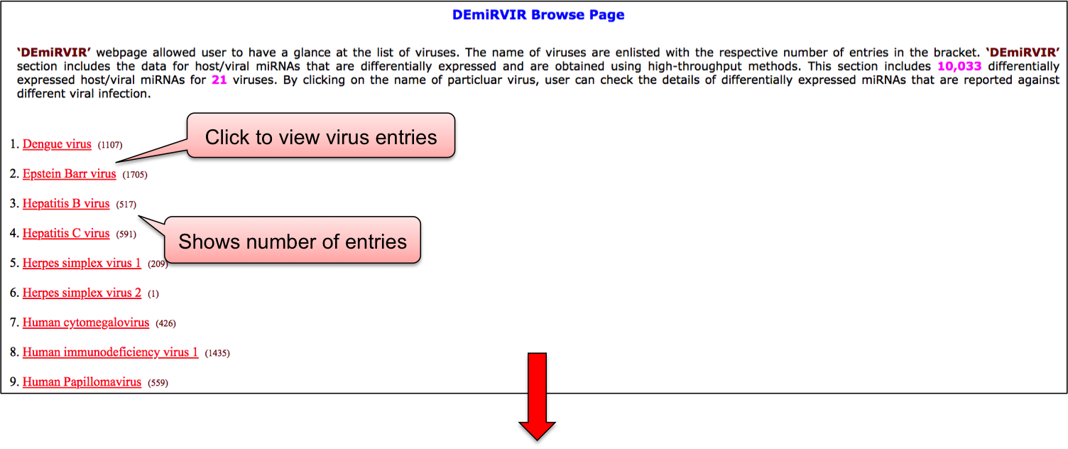 ‘DEmiRVIR’ webpage allowed user to have a glance at the list of viruses. The name of viruses are enlisted with the respective number of entries in the bracket. ‘DEmiRVIR’ section includes the data for host/viral miRNAs that are differentially expressed and are obtained using high-throughput methods. This section includes 10,033 differentially expressed host/viral miRNAs for 21 viruses. By clicking on the name of particluar virus, user can check the details of differentially expressed miRNAs that are reported against different viral infection.