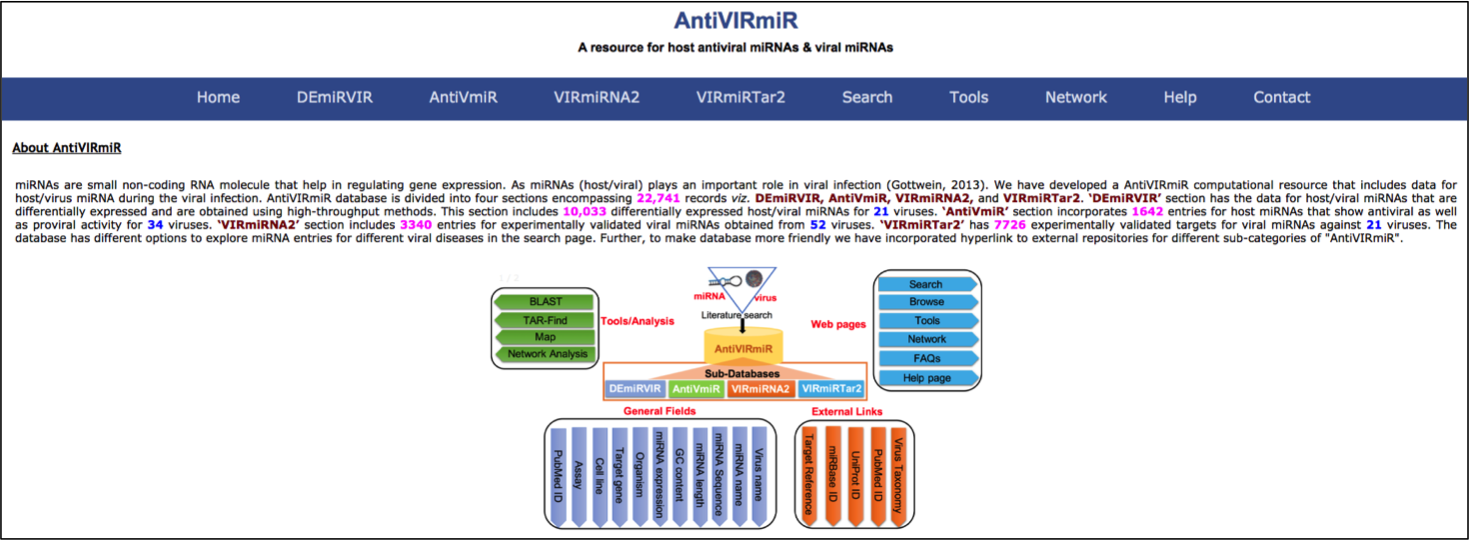 AntiVIRmiR is a computational resource that includes data for host/virus miRNA during the viral infection. AntiVIRmiR resource encompassing 22,741 records is divided into four sections viz. VIRmiRNA2, VIRmiRTar2, AntiVmiR and DEmiRVIR. In ‘DEmiRVIR’ section, we have collected the data for host/viral miRNAs that are differentially expressed and are obtained using high-throughput methods. This section includes 10,033 differentially expressed host/viral miRNAs for 21 viruses.‘AntiVmiR’ section incorporates 1642 entries for host miRNAs that show antiviral as well as proviral activity for 34 viruses.‘VIRmiRNA2’ section includes 3340 entries for experimentally validated viral miRNAs obtained from 56 viruses. ‘VIRmiRTar2’ has 7726 experimentally validated targets for viral miRNAs against 21 viruses.