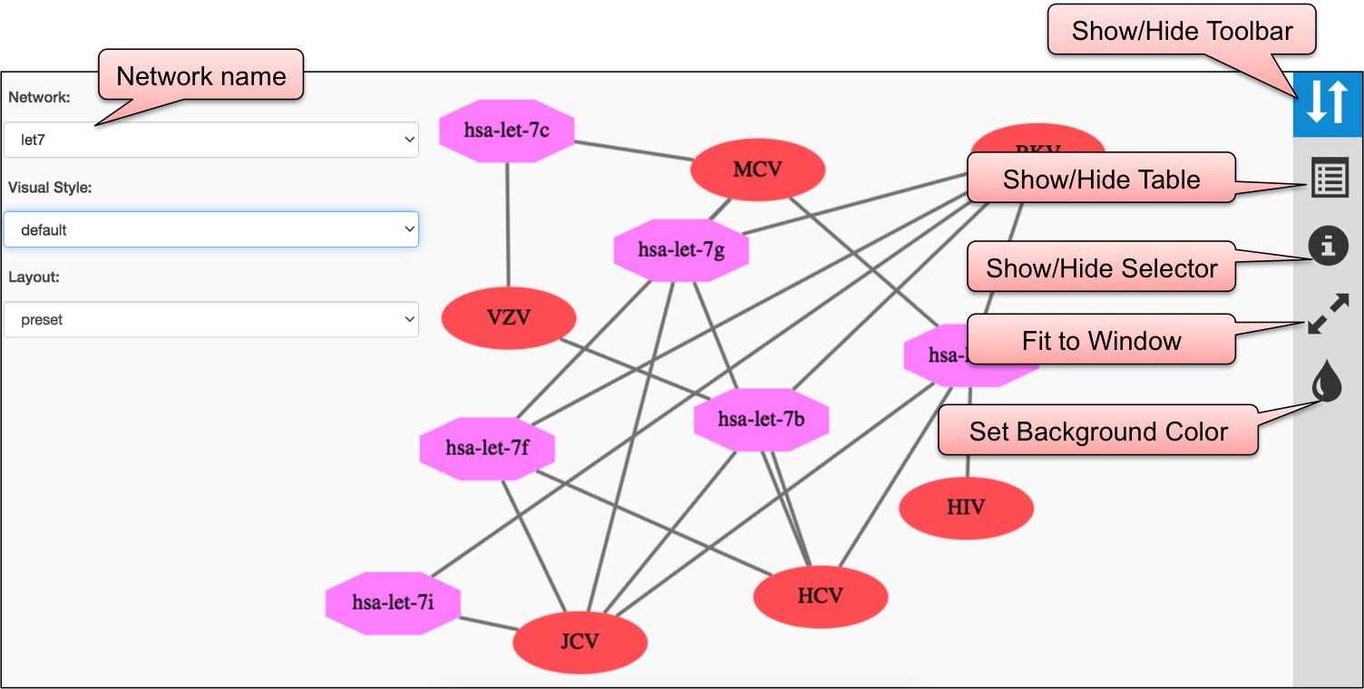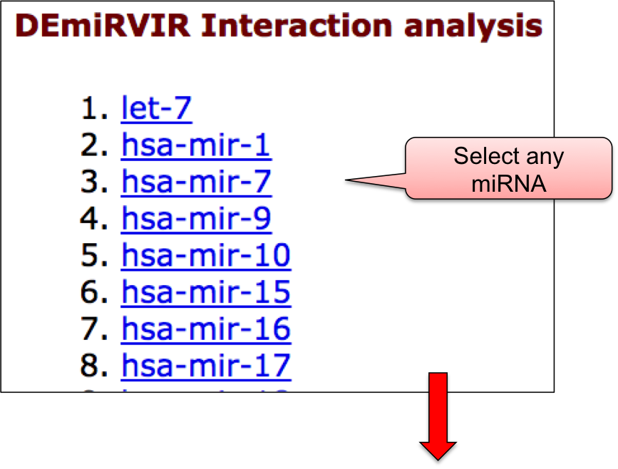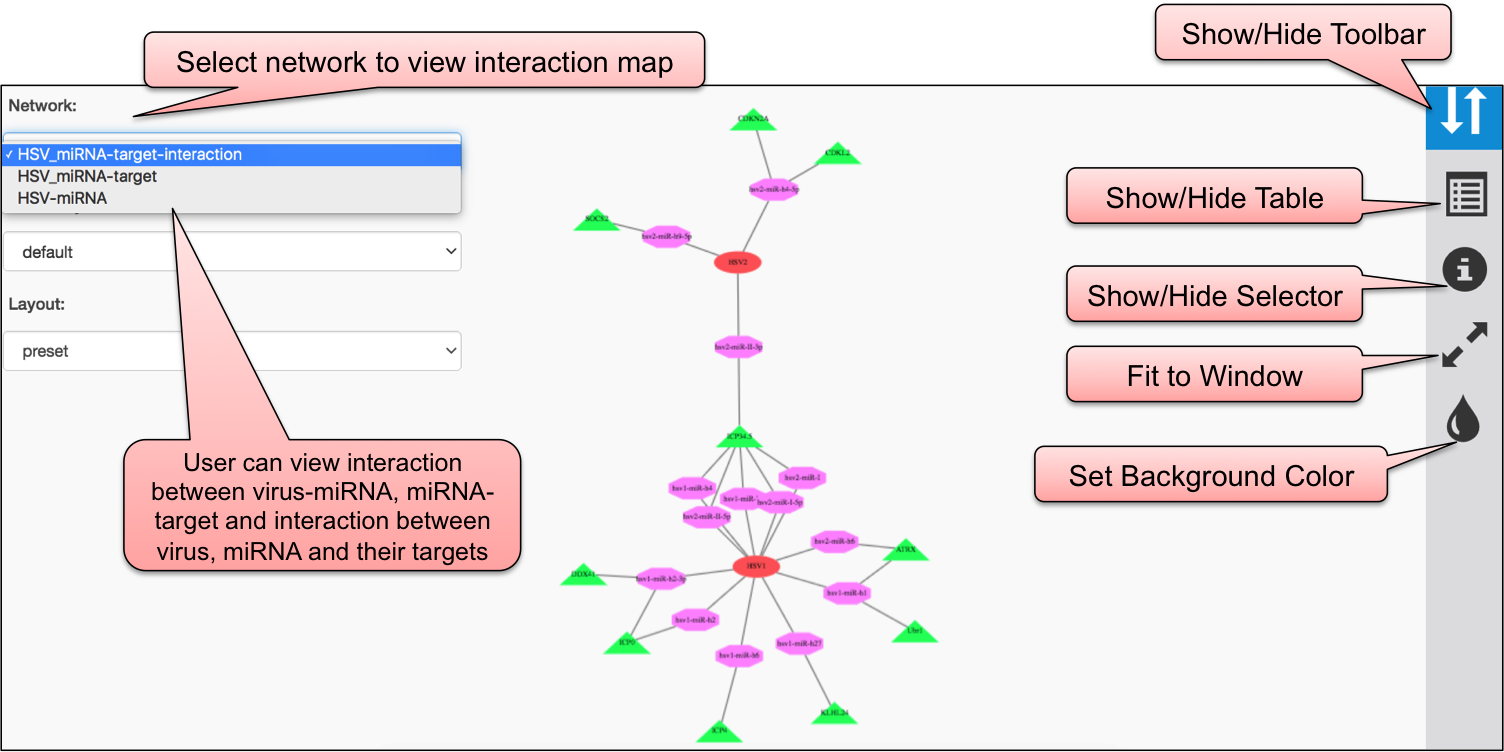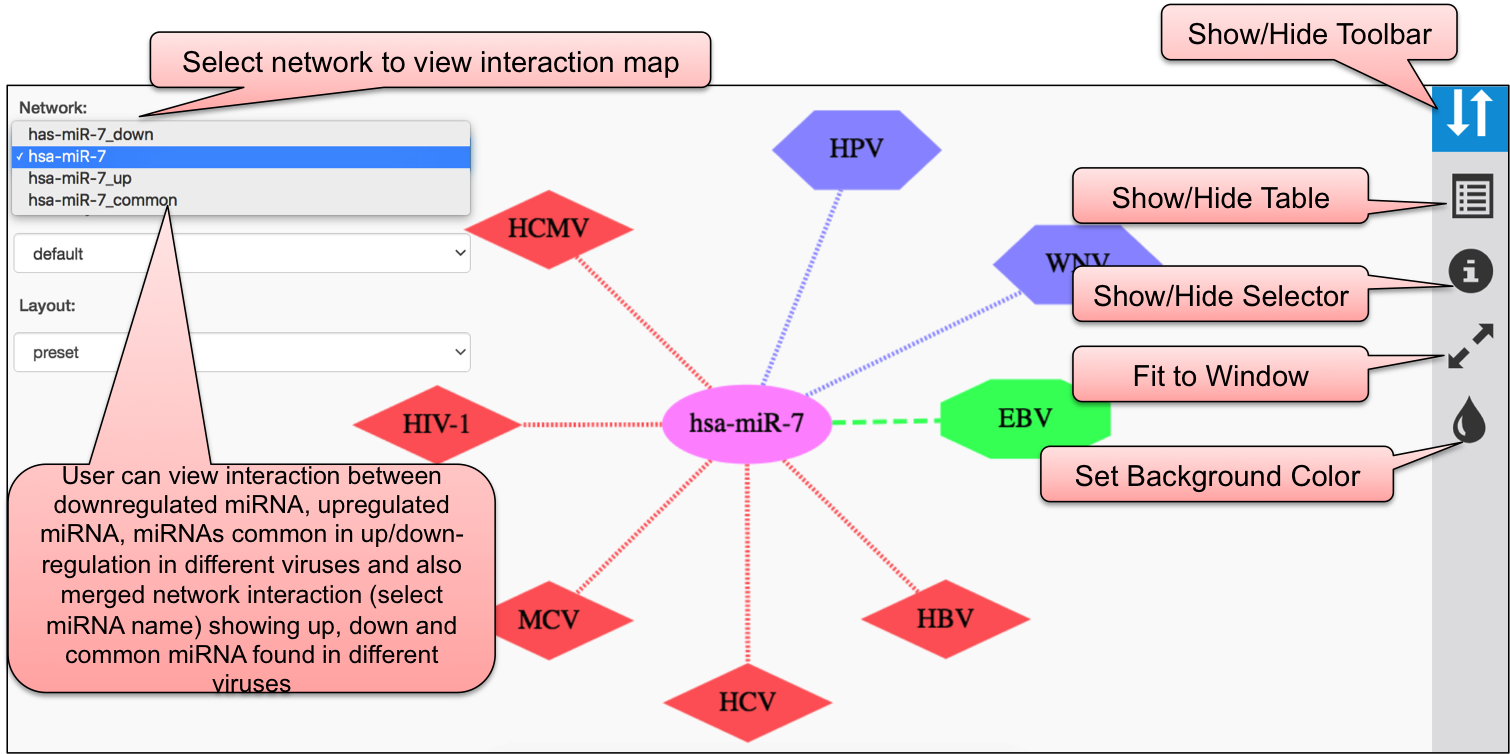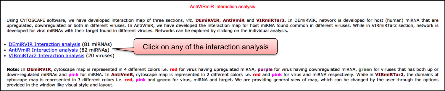 Using CYTOSCAPE software, we have developed interaction map of three sections, viz. DEmiRVIR, AntiVmiR and VIRmiRTar2. In DEmiRVIR, network is developed for host (human) miRNA that are upregulated, downregulated or both in different viruses. Networks can be explored by clicking on the individual analysis.In AntiVIRmiR, we have developed the interaction map for host miRNA found common in different viruses. In the VIRmiRTar2 section, network is developed for viral miRNAs with their target found in different viruses.
