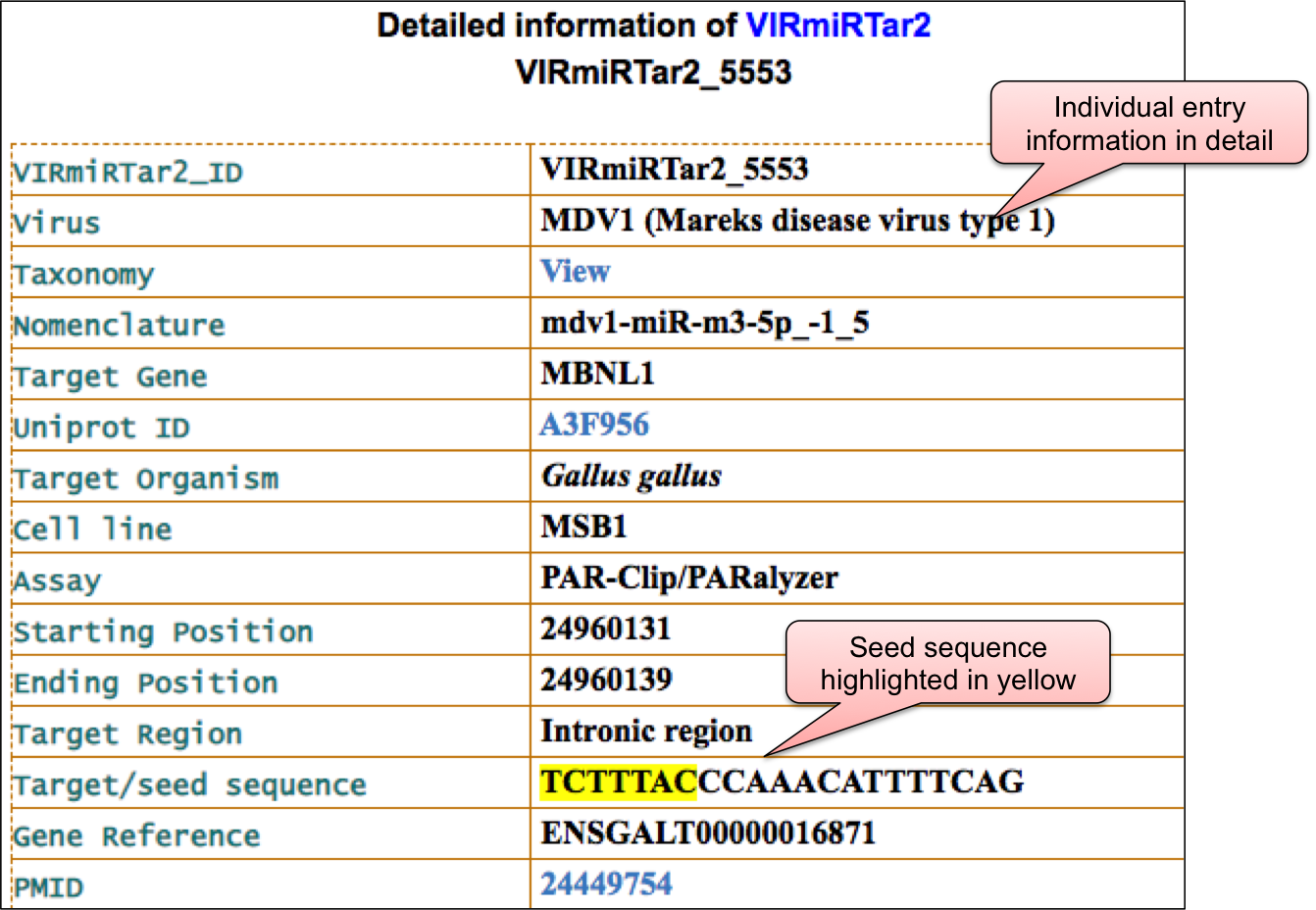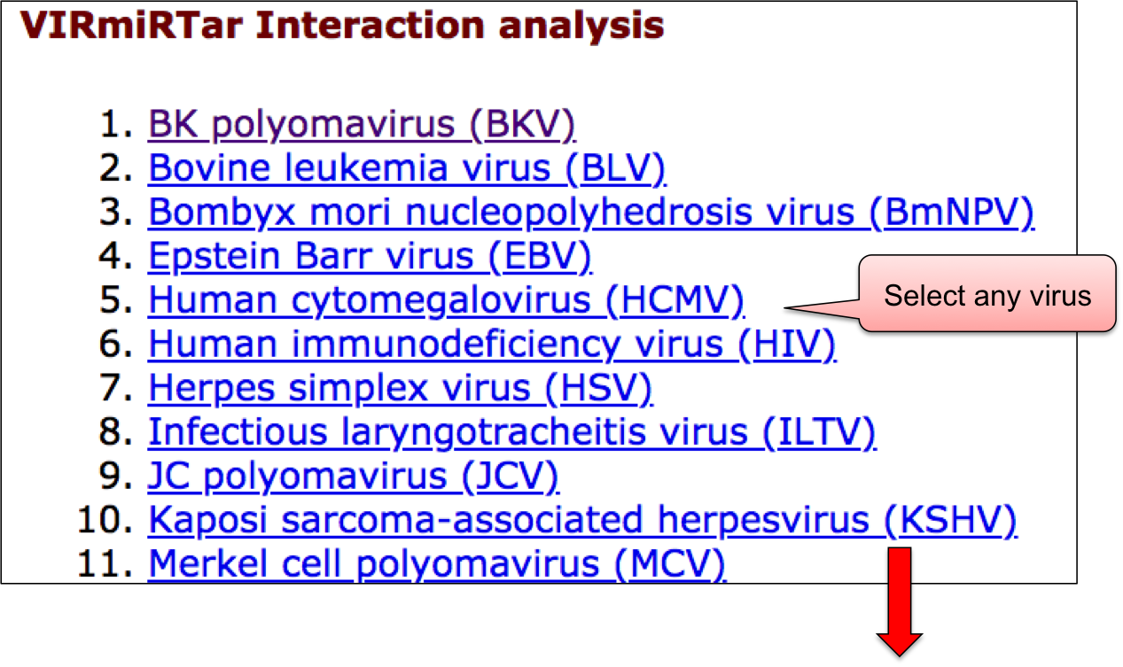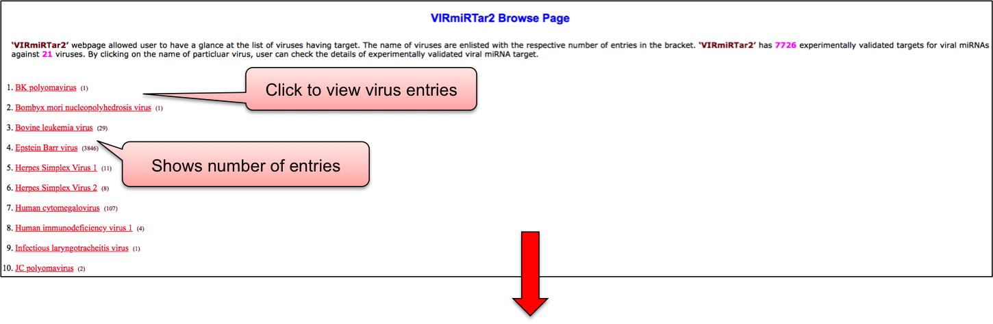 ‘VIRmiRTar2’ webpage allowed user to have a glance at the list of viruses having target. The name of viruses are enlisted with the respective number of entries in the bracket. ‘VIRmiRTar2’ has 7726 experimentally validated targets for viral miRNAs against 21 viruses. By clicking on the name of particluar virus, user can check the details of experimentally validated viral miRNA target.