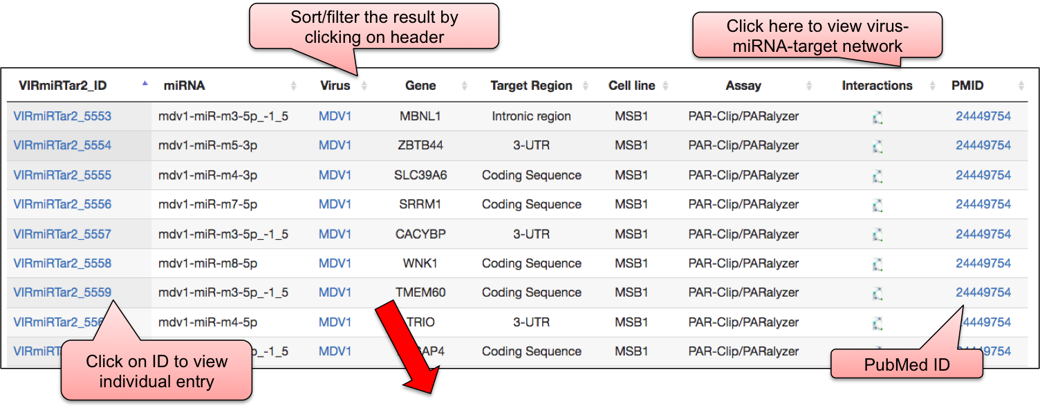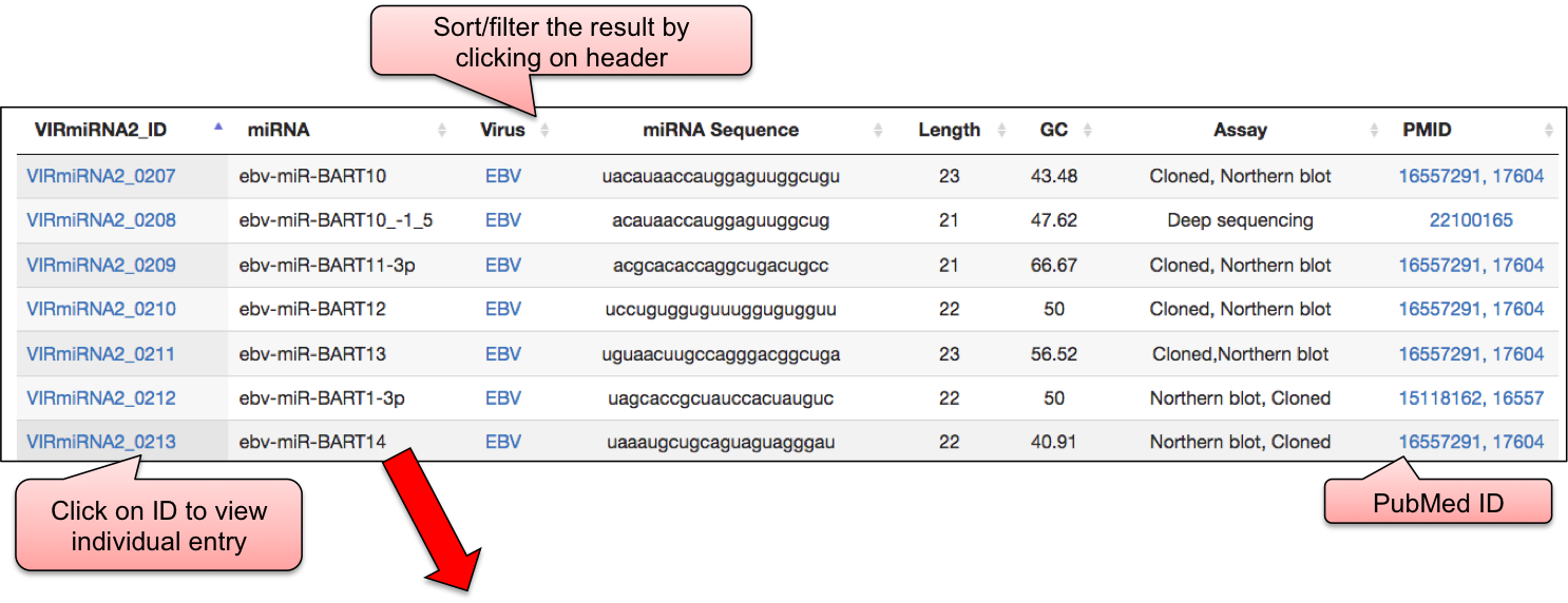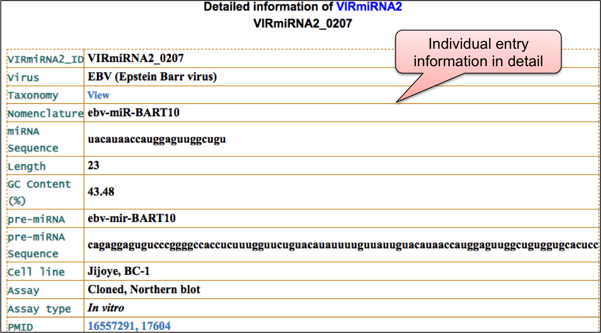 ‘VIRmiRNA2’ browse page allowed user to have a glance at the list of viruses. The name of viruses are enlisted with the respective number of entries in the bracket. This section includes 3340 entries for experimentally validated viral miRNAs obtained from 56 viruses. By clicking on the name of particluar virus, user can check the details of experimentally validated viral miRNA.