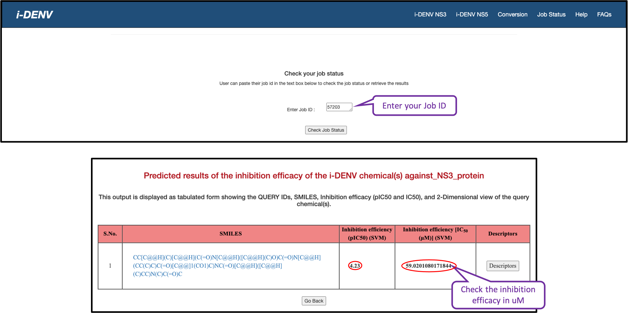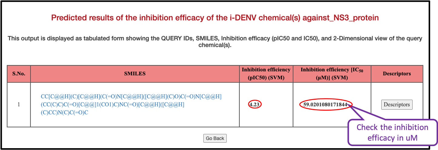 i-DENV predict eficacy on Support Vector Machine (SVM) model. The input will be provided in SDF format and the output will be achieved in tabulated form with the information on IC50 values of the query chemicals.
