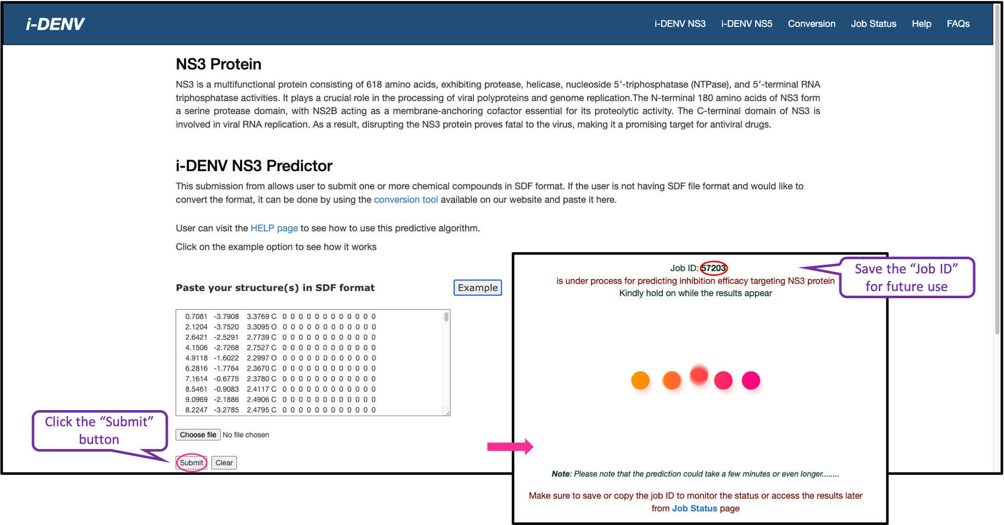 In the "i-DENV" webserver, we are providing the facility to retrieve the results using the job id with the help of "Job Status" webpage